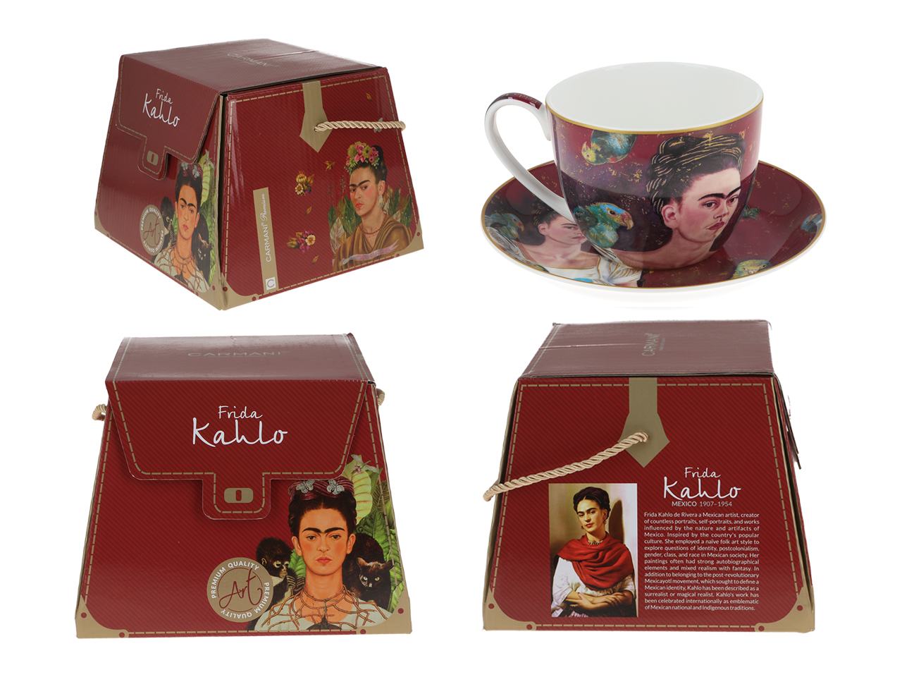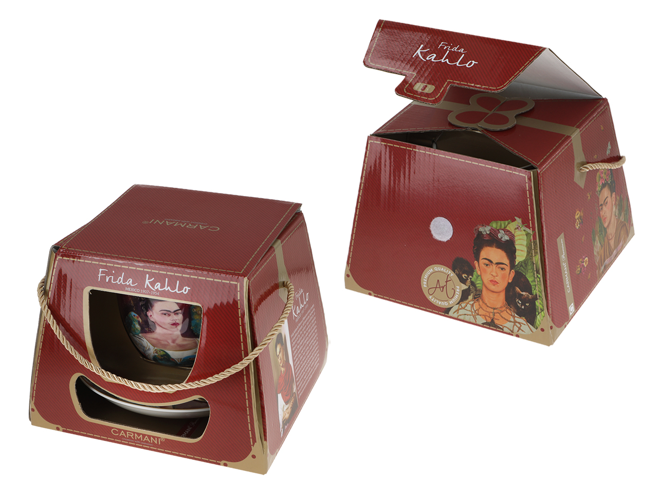 Frida Kahlo to postać fascynująca, przejmująca i inspirująca. Jej twórczośc determinowana cierpieniem fizycznym, zaskakuje kolorami, barwną meksykańską symboliką. Autoportrety malarki doskonale prezentują się na dużych filiżankach z porcelany.