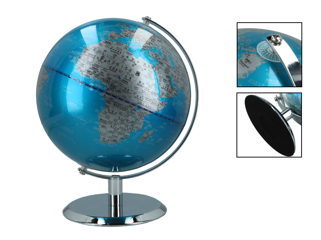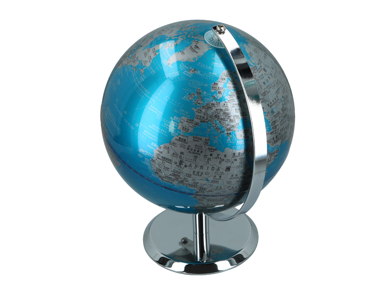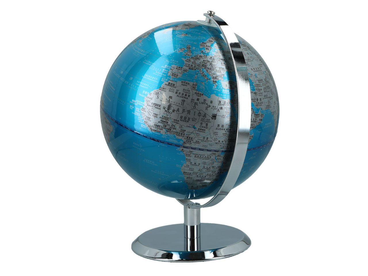 Utrzymany w kolorystyce niebiesko – srebrnej, bardzo elegancki globus będzie świetną dekoracją salonu. A może będzie netchnieniem do podróży?