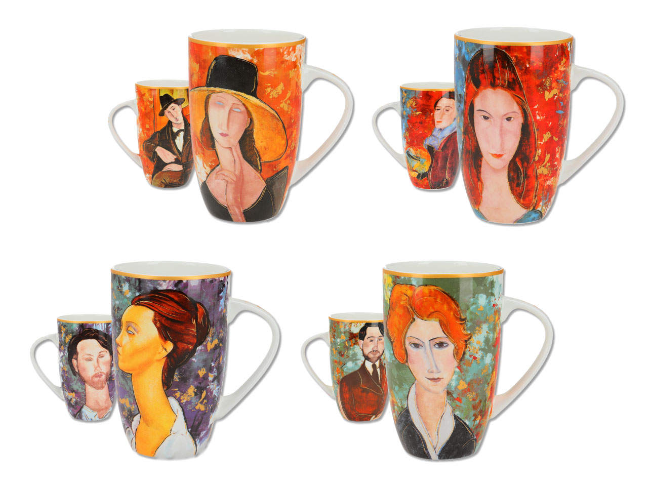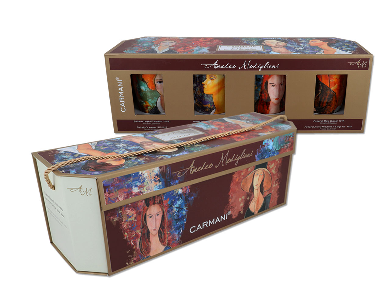 Komplet 4 kubków z popularnymi dziełami włoskiego malarza Amedea Modiglianiego. Kubki wyróżniają się nie tylko pięknymi wzorami ale także unikatowym kształtem. Całość koronuje opakowanie kształtem przypominające kuferek.