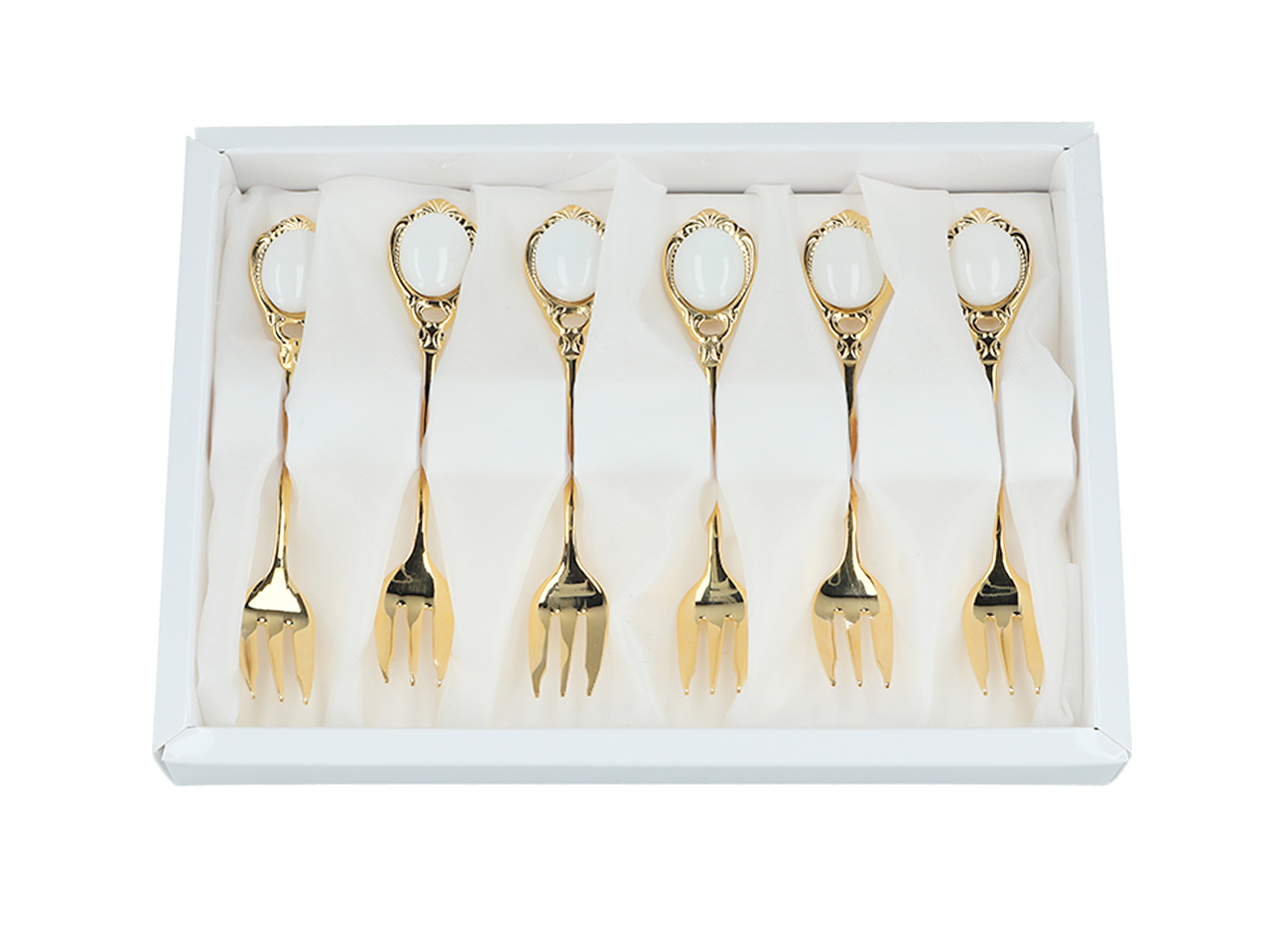 Zestaw składa się z 6 ozdobnych widelczyków w kolorze złotym. Zapakowane w białe, eleganckie pudełko.