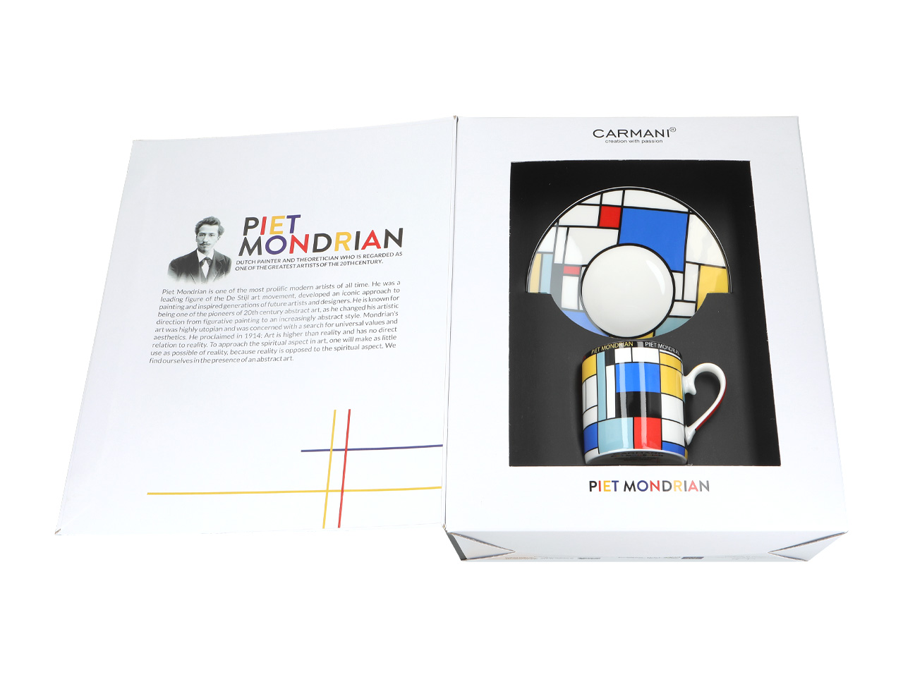Prosty kształt filiżanki oraz oryginalne, nowoczesne wzornictwo, to świetny pomysł na prezent dla miłośników sztuki współczesnej. Tym bardziej, że Modrian miał ogromny wpływ na rozwój abstrakcjonizmu w malarstwie.