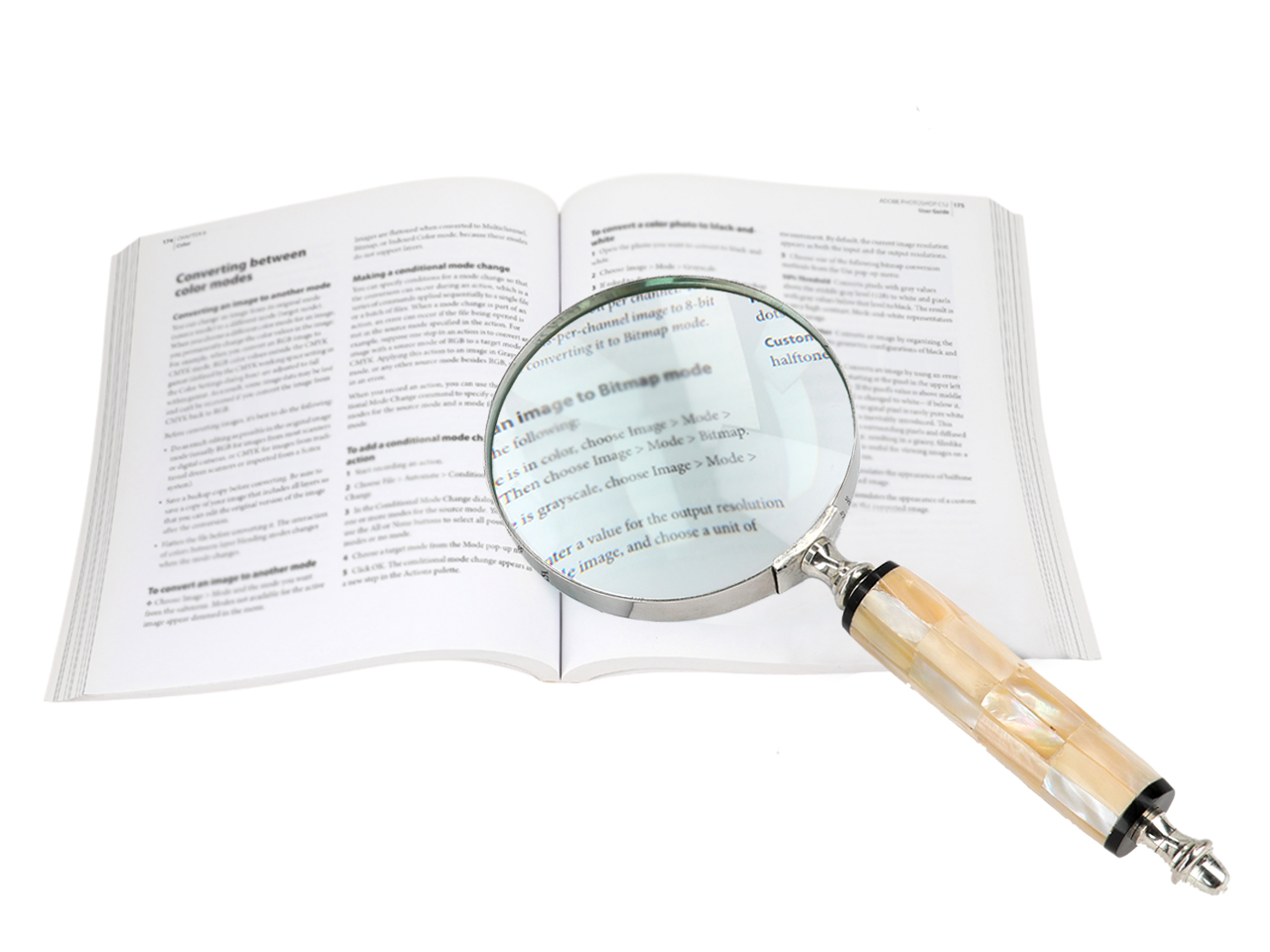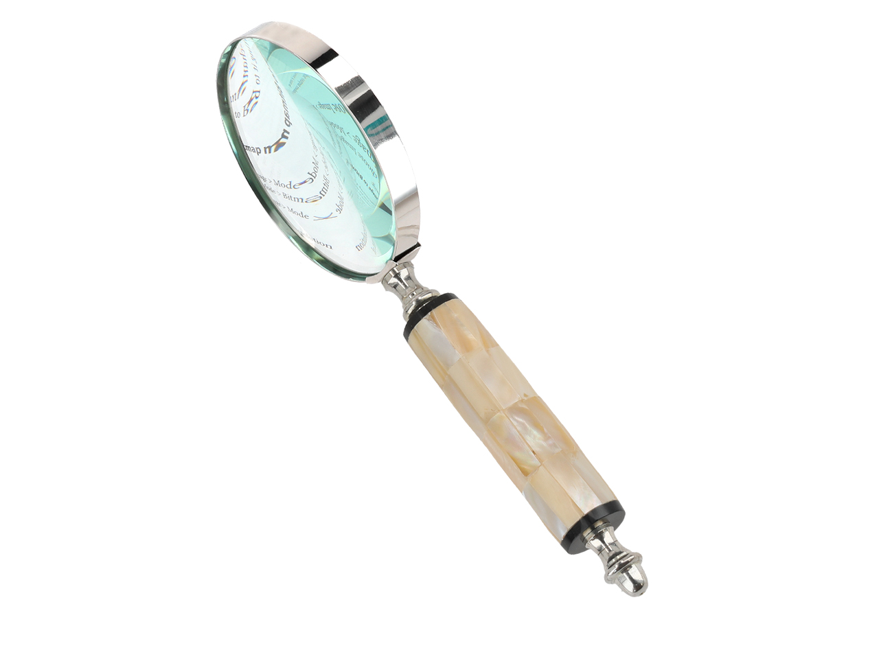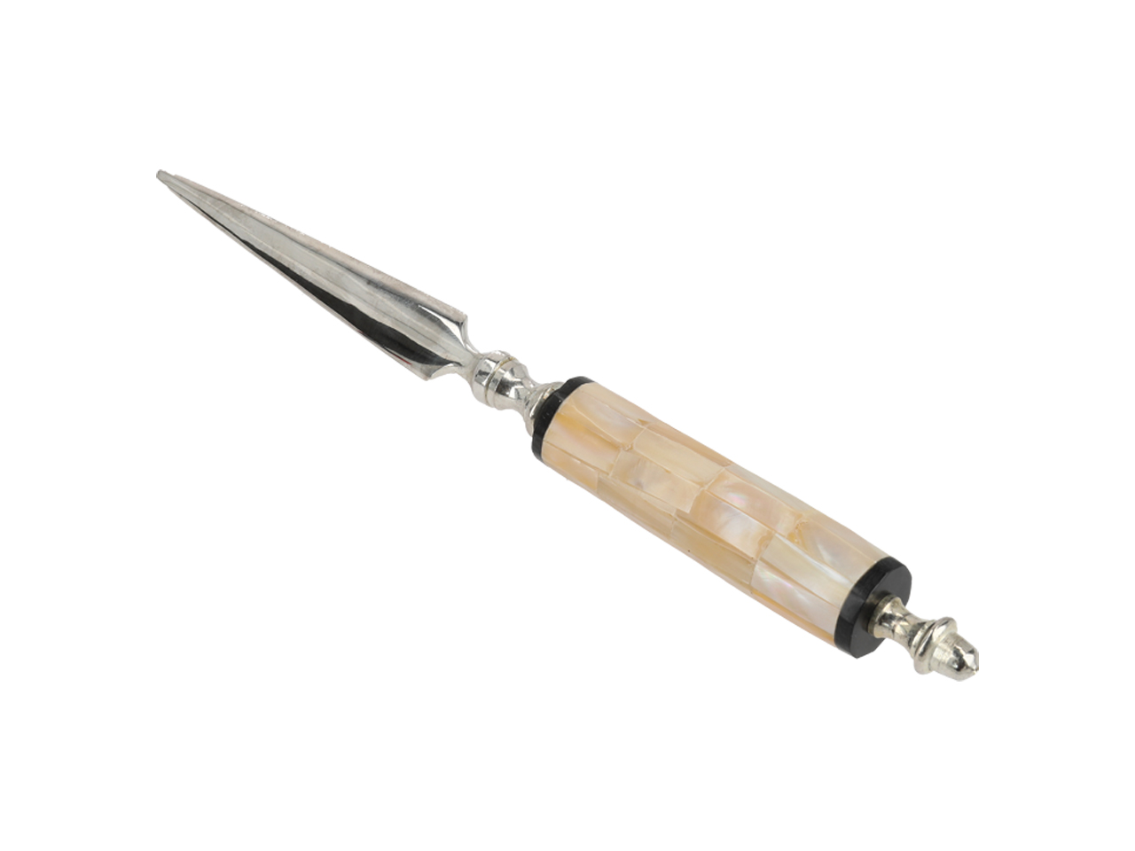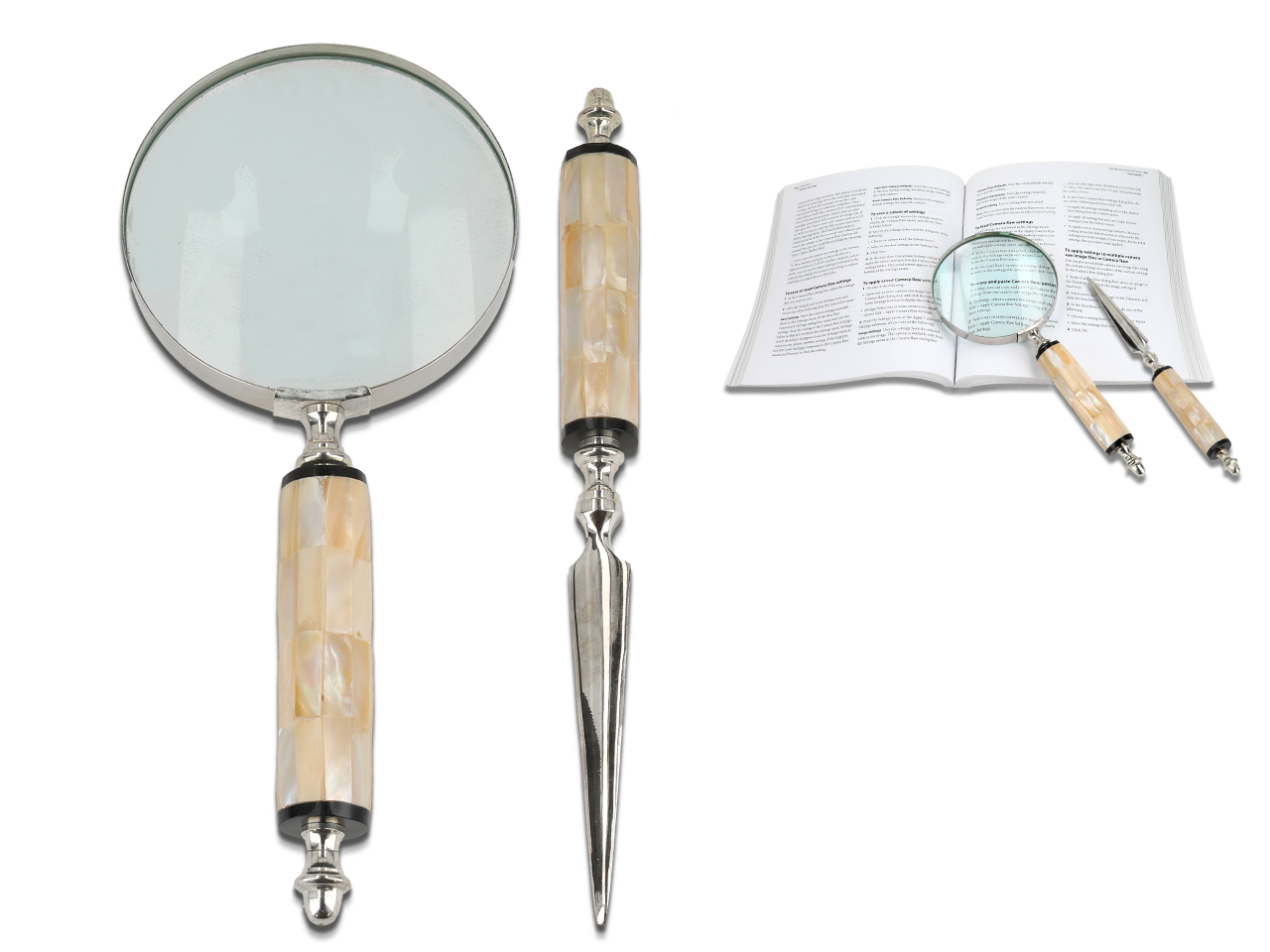 Eleganci komplet: szkło powiększające i nożyk do listów – oba wykonane w mosiądzu, a rączka ozdobiona jest masą perłową.