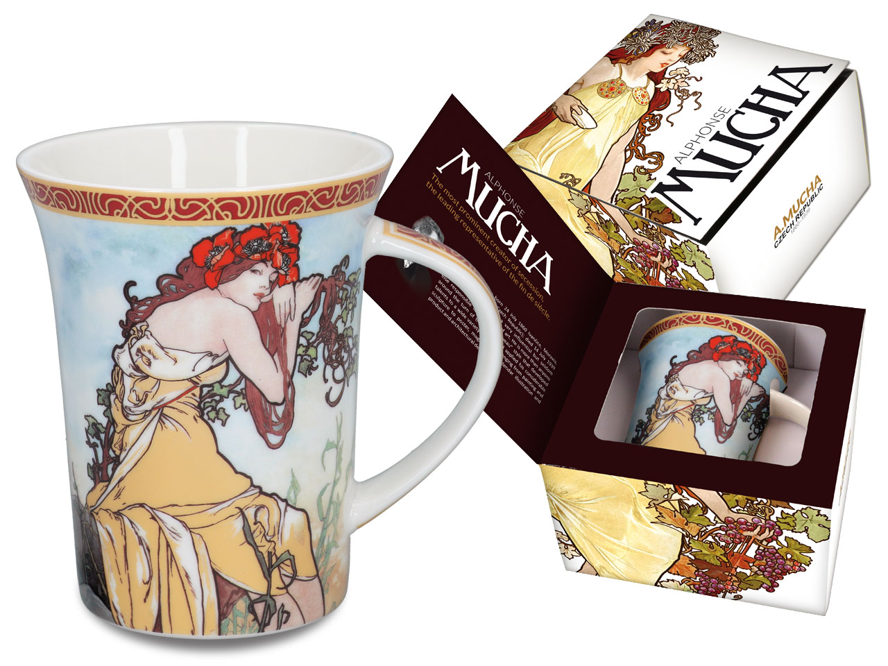 Elegancki kubek. przedstawiający twórczość Alfonsa Muchy. Zapakowany w opakowanie prezentowe. nadaje się idealnie jako prezent.