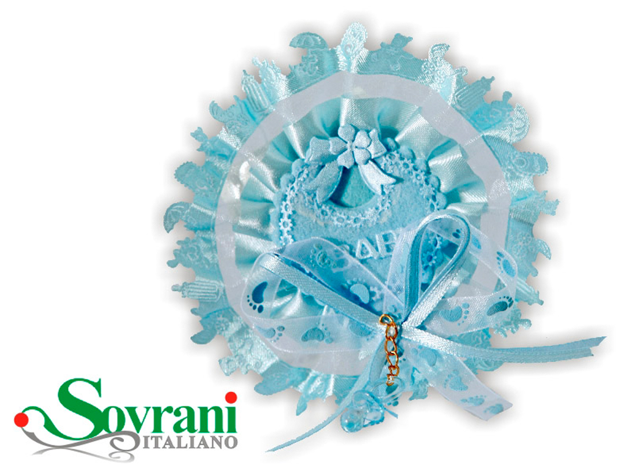 Śliczna dziecięca ozdoba w różnych odcieniach błękitu. Wykonana z przyjemnego w dotyku materiału. z dużą starannością. W środku kokarda. napis BABY i liczne maleńkie haftowane kwiatuszki. Brzegi ozdobiono przedmiotami. które