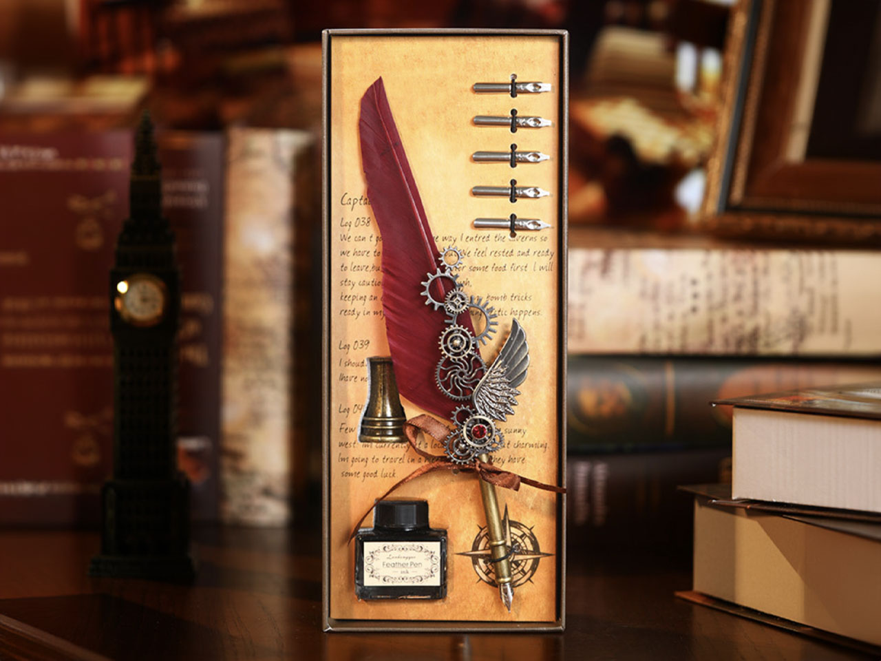 Zestaw piśmienniczy – Pióro bordowe z kałamrzem, atramentem i 5 stalówkami